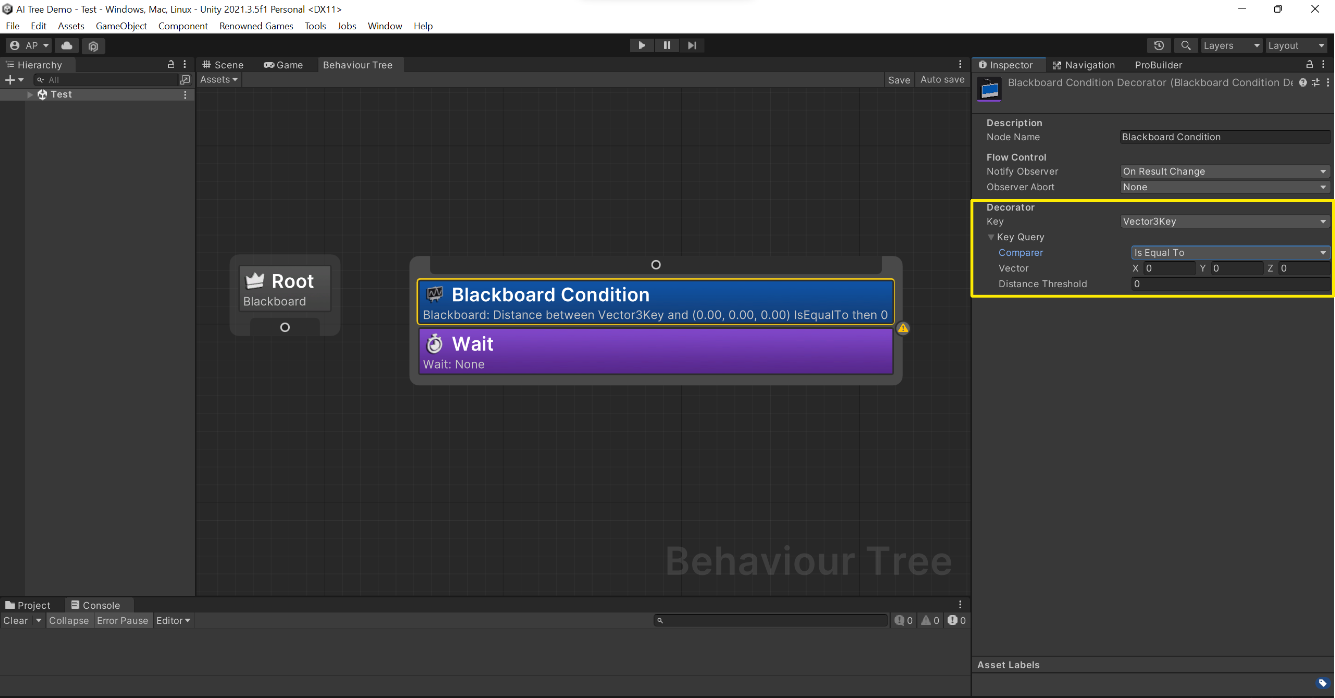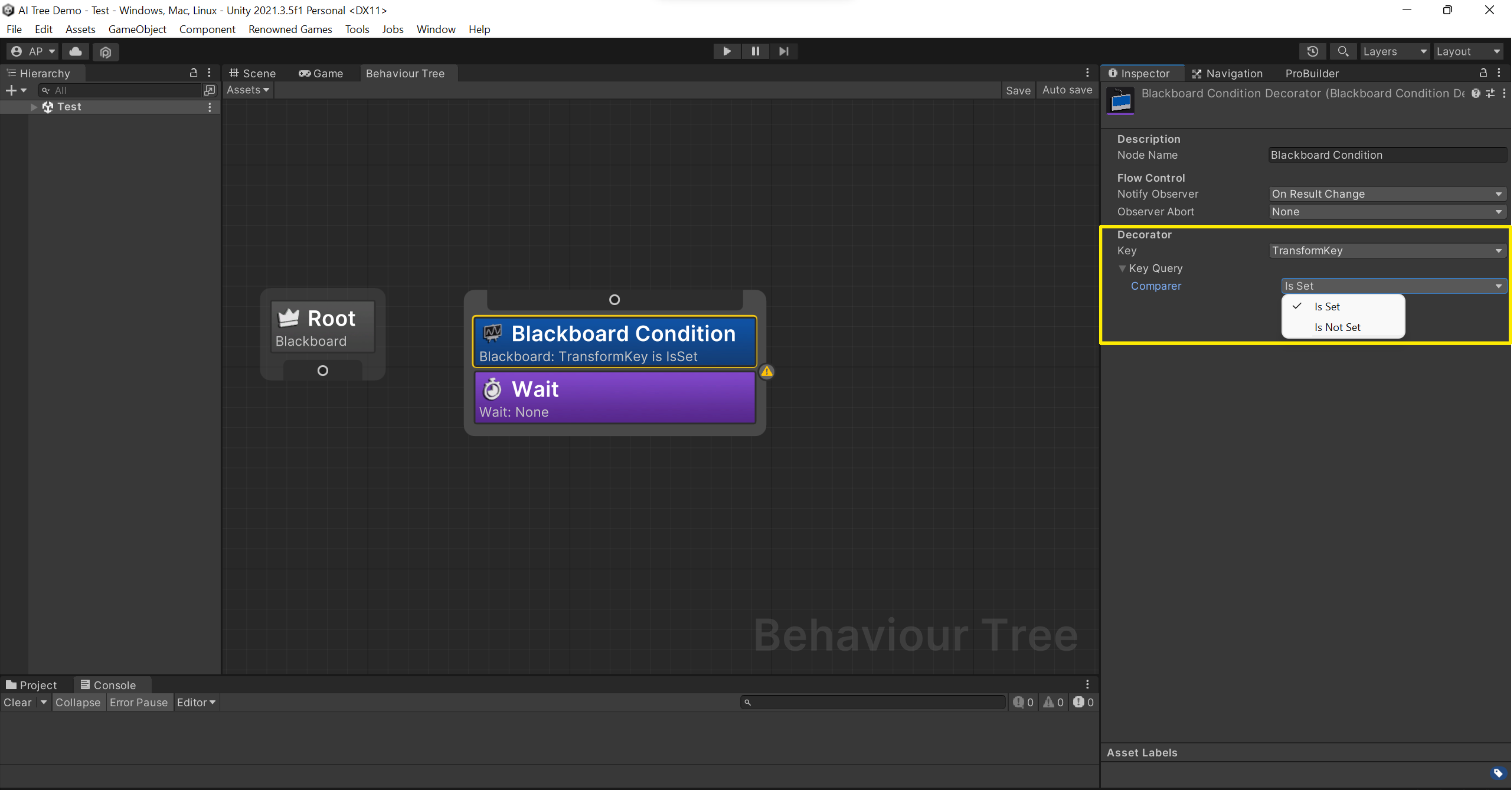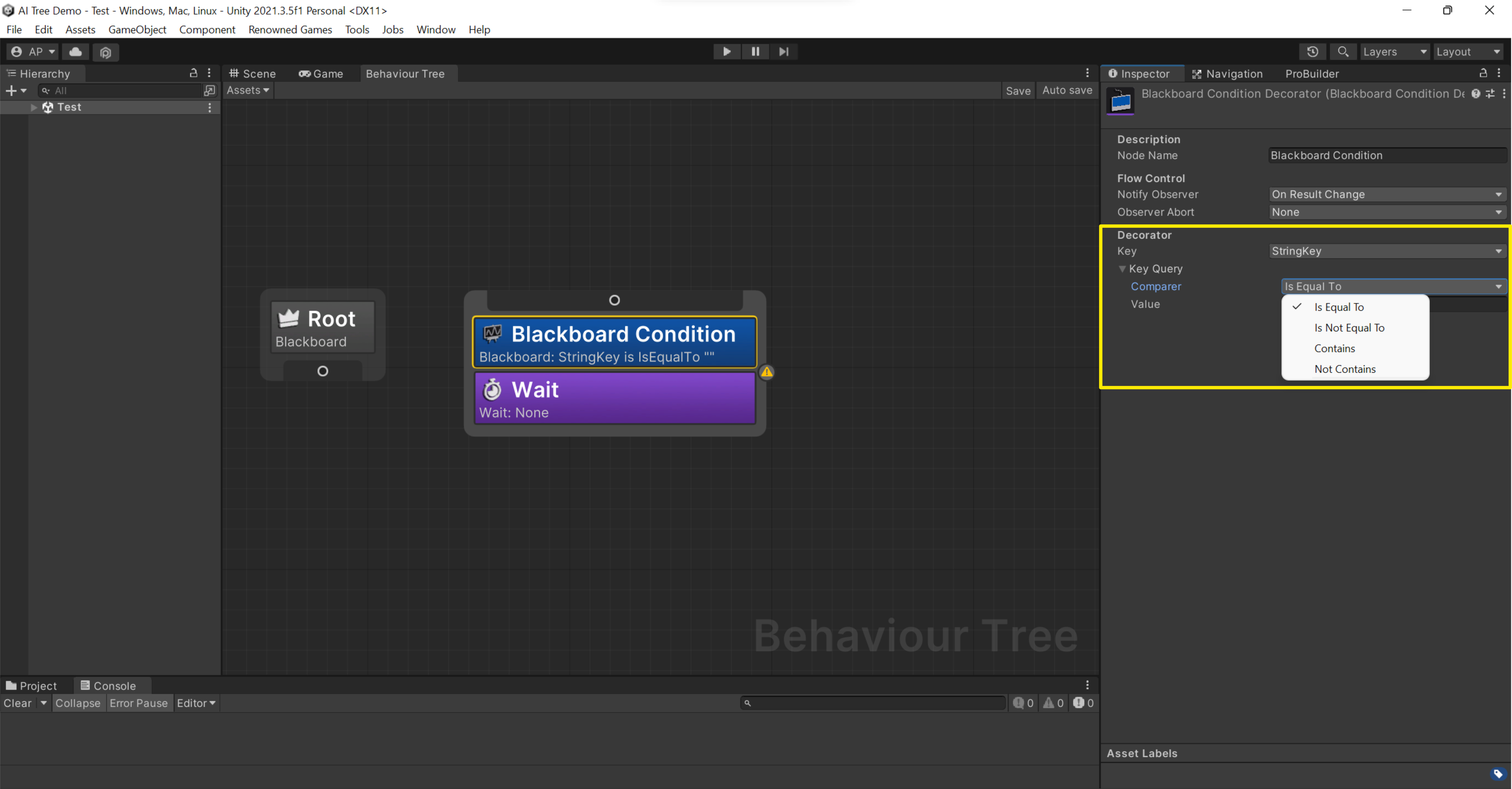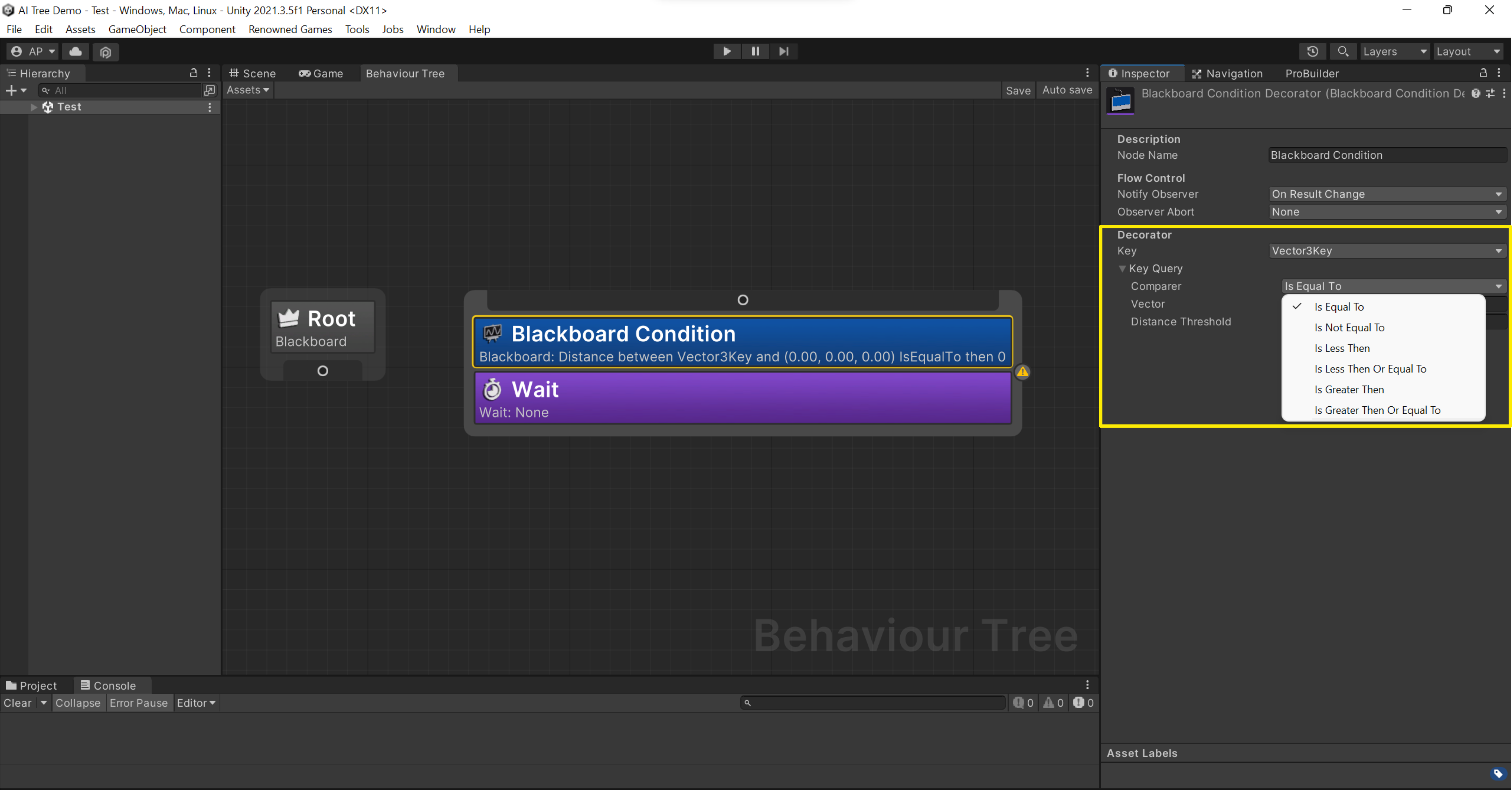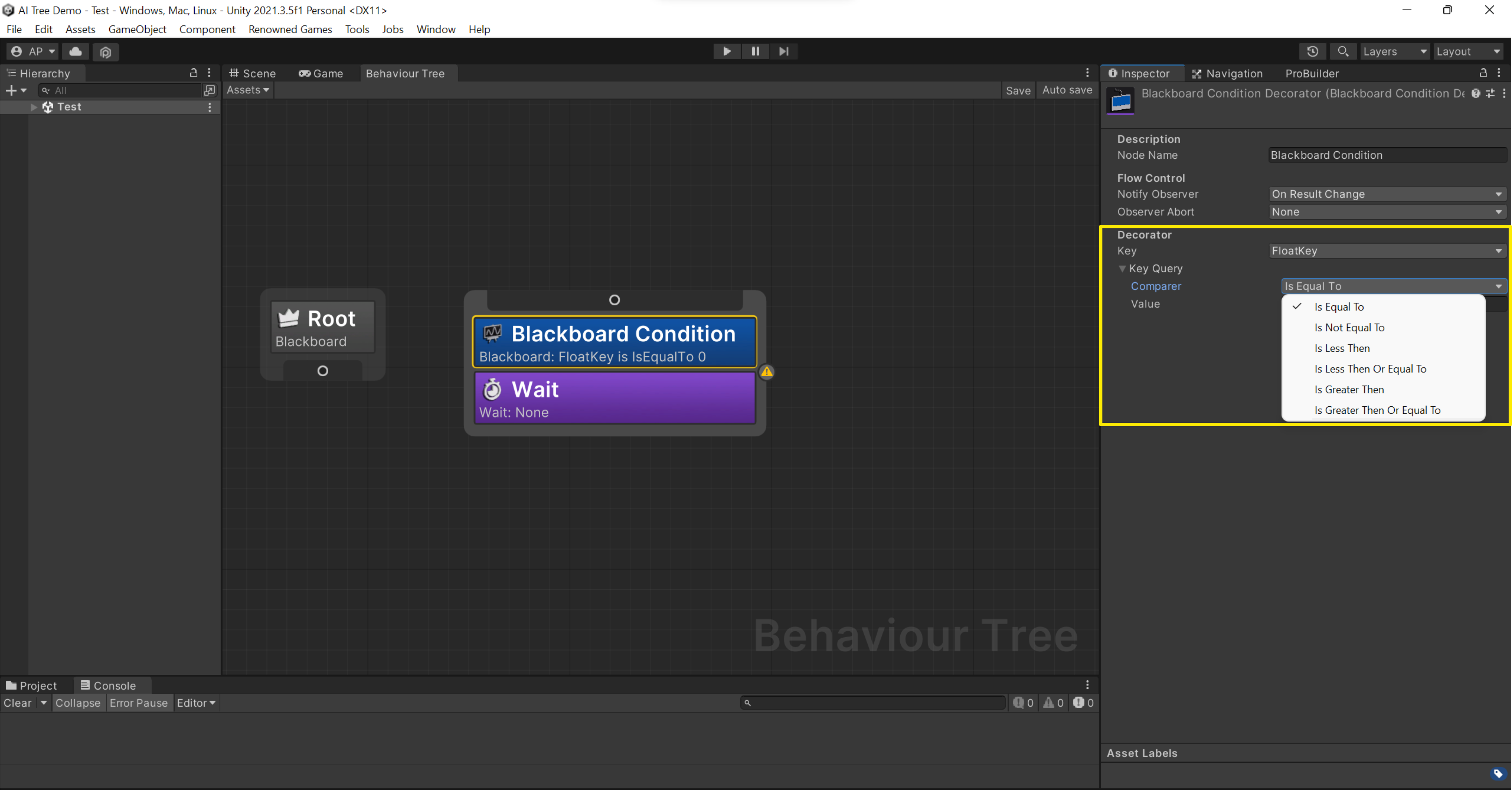 * **Equal**: If the AI should only attack an enemy if its health is equal to 100%, the decorator will use "equal to 100%".