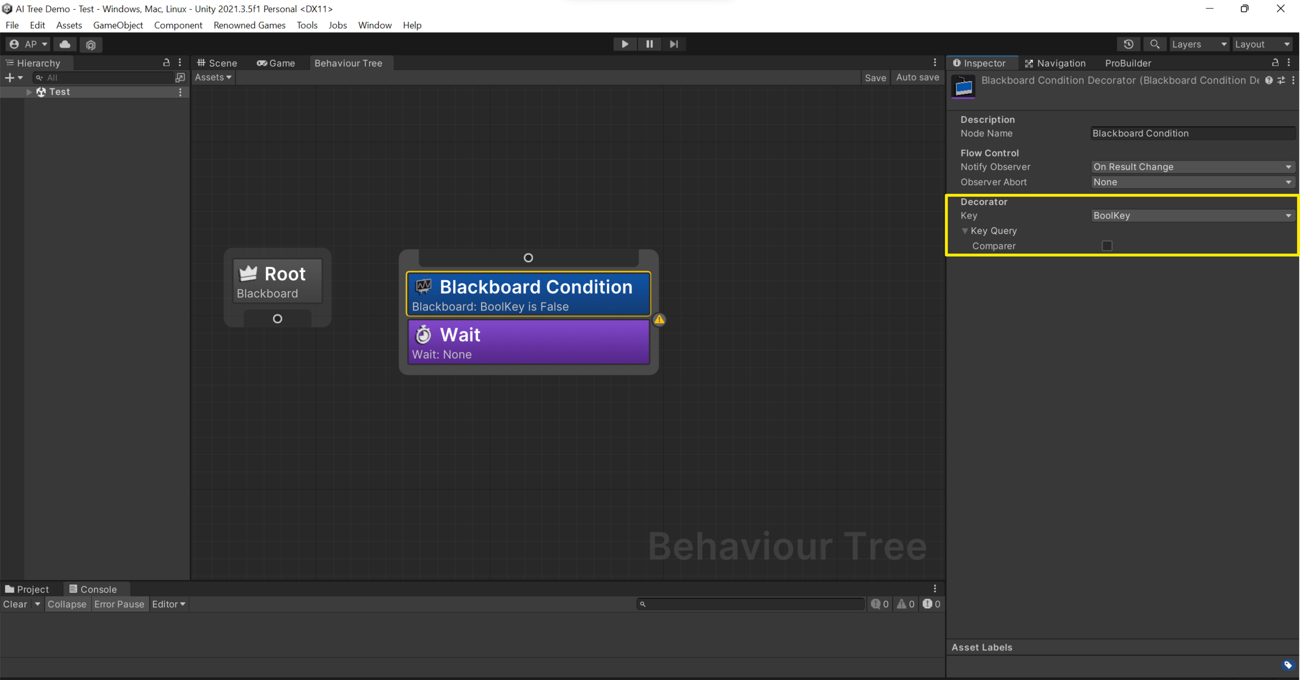 * **Self**: If the AI is chasing an enemy, but the enemy goes out of sight, the condition becomes false, and the chase branch is aborted. The AI may switch to another action, like returning to patrol.