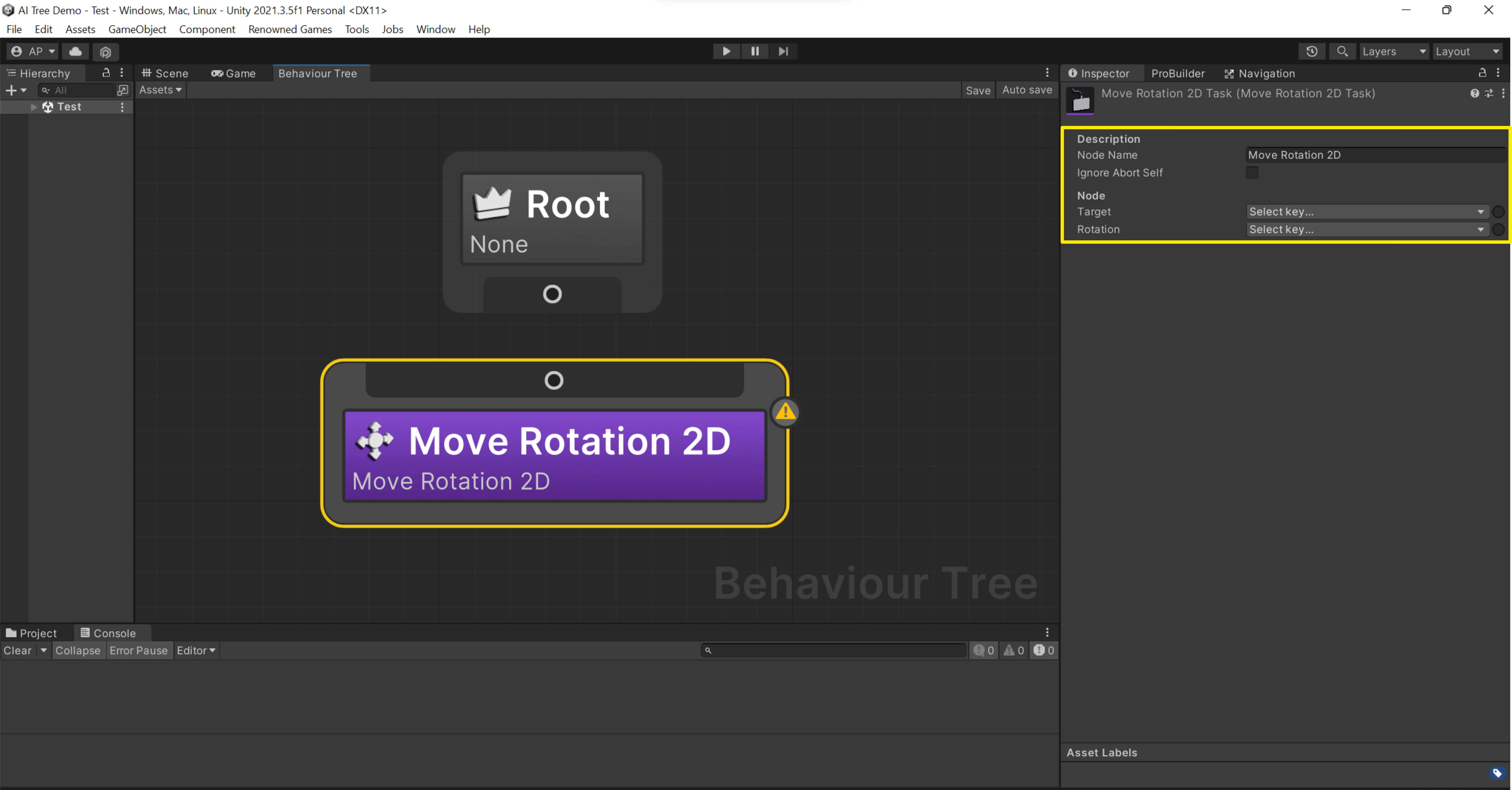 **To create it**, right-click on free space in AI Tree inspector and select <mark style="color:purple;">Create Node/Tasks/Rigidbody2D/Move Rotation 2D.</mark>